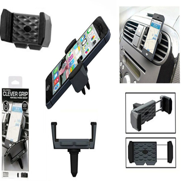 Clever Grip Portable Phone Mount great for GPS, hands-free talking, video chat, music, and movies. It features a firm grip that fits all car vents, 360-degree swivel action, rotates to use at any angle, extends to fit most smartphones. Works with iPhone, Blackberry, Android, Windows smartphones.
