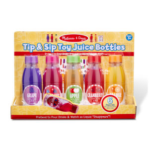 Pretend to pour refreshing drinks, and watch as the liquid in these five durable plastic juice bottles disappears! Stock play kitchens, grocery stores and picnic baskets with Grape, Orange, Cranberry, Apple, and Berry Mix bottles. The reusable menu card lets kids three and older place orders and offers creative combinations to spark play ideas. Not only will this play set quench a thirst for pretend play, it promotes early learning skills like color recognition, language, sensory development, and more! 3+ years